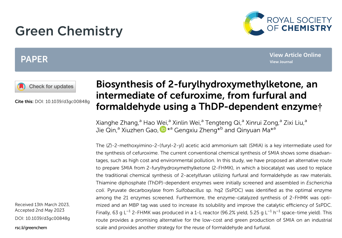 近日,我校williamhill英国马钦元/高秀珍团队在生物催化合成头孢呋辛关键中间体方面取得了重要进展,相关成果以“ Biosynthesis of 2-furylhydroxymethylketone, an intermediate of cefuroxime, from furfural and formaldehyde using a ThDP-dependent enzyme”为题发表在本领域顶刊Green Chemistry(IF:11.034)。文章首次实现了头孢呋辛关键中间体的高效生物合成。