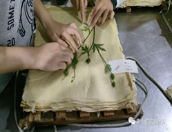 压片后的干植物需要在台纸上进行缝制,陈老师亲自为实践团成员演示缝制过程,在台纸上穿针引线,将其以一定形态进行固定,熟练的操作引起团队成员强烈的兴趣,成员纷纷尝试,相互帮助,相互交流,分享缝制的方法与经验。在制作标本的过程中,团队成员主动向陈老师询问相关中草药材的治疗功效,在实践的同时收获了中草药的药理学知识,加深了对中草药的理解。