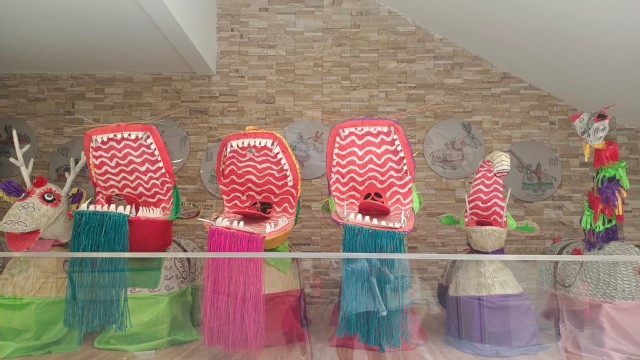 在展厅的入口处,摆放着八仙灯舞蹈中所用的道具——八兽,其形态各异,惟妙惟肖。相传清代光绪年间,蒙阴县突发瘟疫,田地荒芜,八仙过海路过此地,村民们为祈盼风调雨顺,祛瘟治病,人丁兴旺,扮成八仙中各个人物,身骑八只怪兽,作气势强悍奔放的表演。