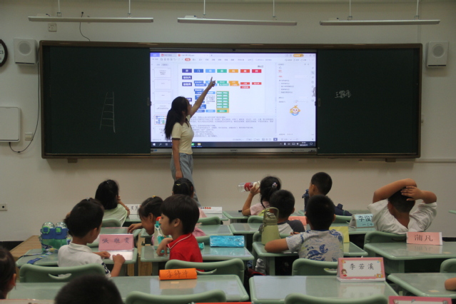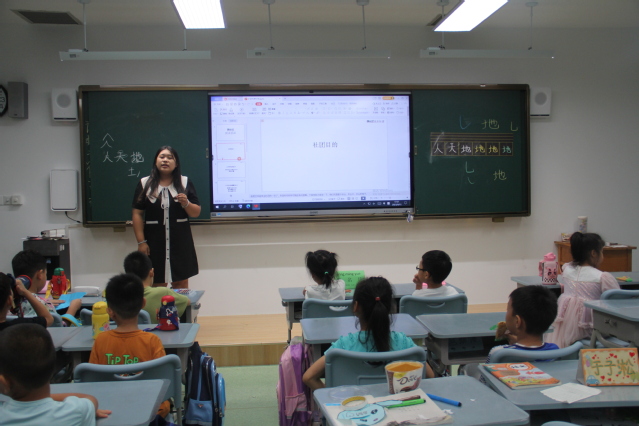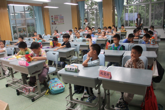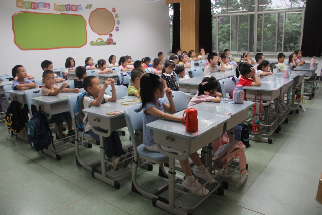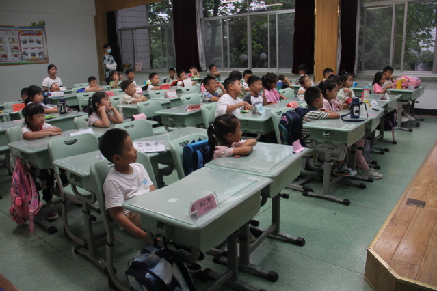 志愿者在市委党校校区门口集合完毕后,由弋坤带领进入校区,志愿者区分好自己所带班级后清点班级人数。“小手怎么办”“小嘴巴闭起来”志愿者们温柔提醒学生开始上课。