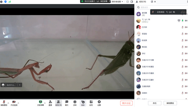 当天中午,超自然昆虫社区负责人弋坤于腾讯会议向志愿者讲解工作顺序、主讲及助教的主要职责及主讲PPT,并强调要把学生安全放在第一位作为重要原则。他讲到,主讲作为整个课堂的主心骨,要从容,不要紧张,树立好个人形象。助教工作阶段性较强,要核实好孩子们的具体情况。