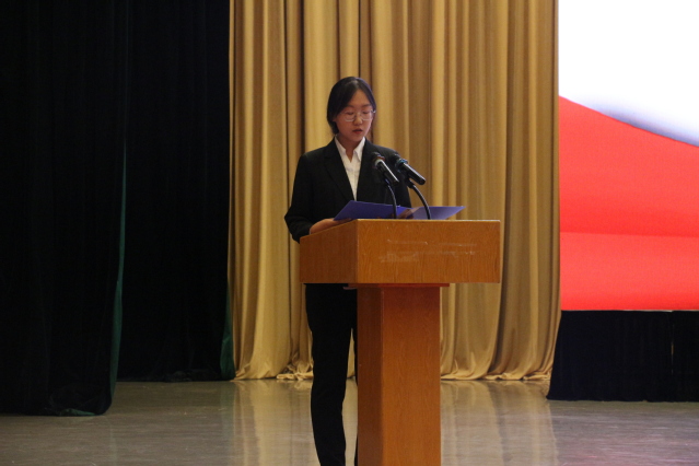 陈楠楠作研究生代表发言。她讲到,作为一名研究生,要保持初心,求真力行;要脚踏实地,自强不息,打造过硬本领;要充满好奇,挑战未知,保持旺盛探索能力。生于新时代,应主动扛起新时代赋予的使命与重任,在校训的熏陶下,向阳而生,逐光而行。