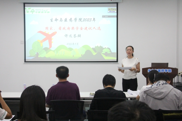 9月21日下午,学院在13号教学楼215室召开2023年国家奖学金、省政府奖学金评选答辩会,学院党委副书记姜素琼出席并主持会议。院生物科学系主任张建勇、生物工程系主任高秀珍、制药工程系教师代表孙文龙,辅导员翟静涛、李超、陈颖洁以及各年级学生代表作为评委会成员参加会议。各年级部分观摩学生列席。