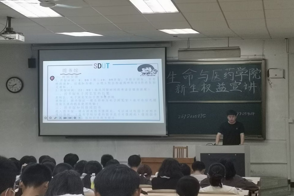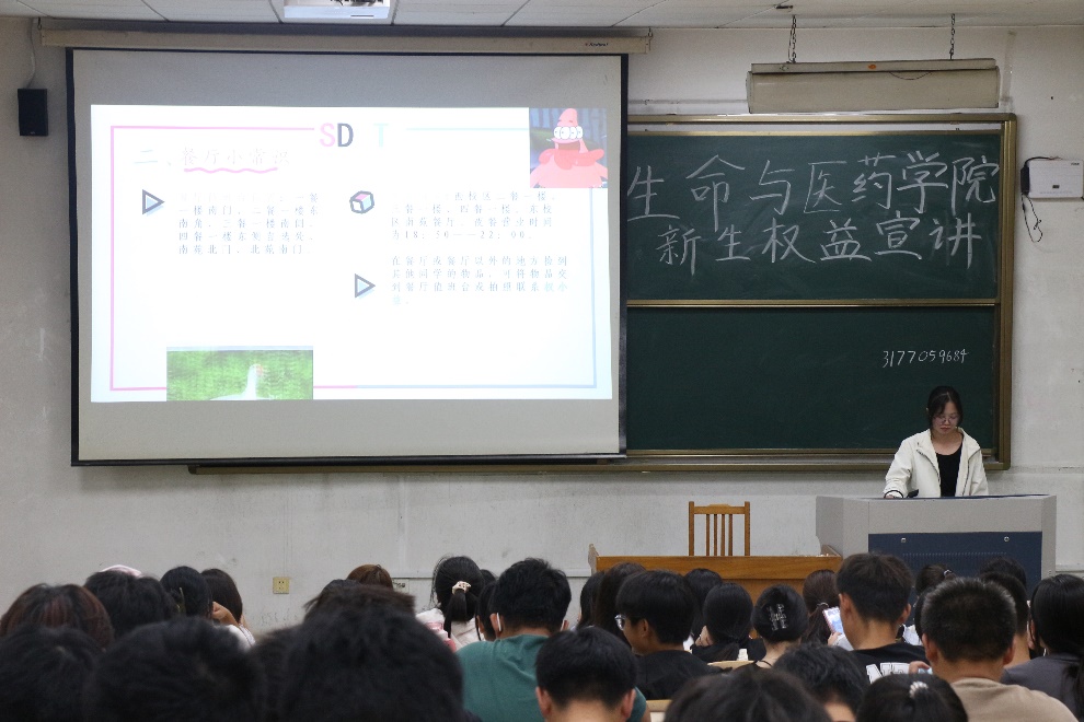 首先宣讲人简介院权益部的宗旨、主要职责,并从学习篇、生活篇、安全篇三个方面讲述权益是什么,如何独立自主学习生活,自己在校有哪些合法权益,怎样合法维护自己的权益。他们介绍到东西校区的教学楼、实验室的具体位置,并着重强调了自习室的使用和安排。他们讲到图书馆的预约与使用、校园卡的充值与挂失、就餐过程遇饮食问题解决途径、洗衣机的使用、宿舍注意事项、校园网使用,以及故障检测报修等一系列实际问题,为同学们提供切实有效的方法和途径,更好的适应学校生活。