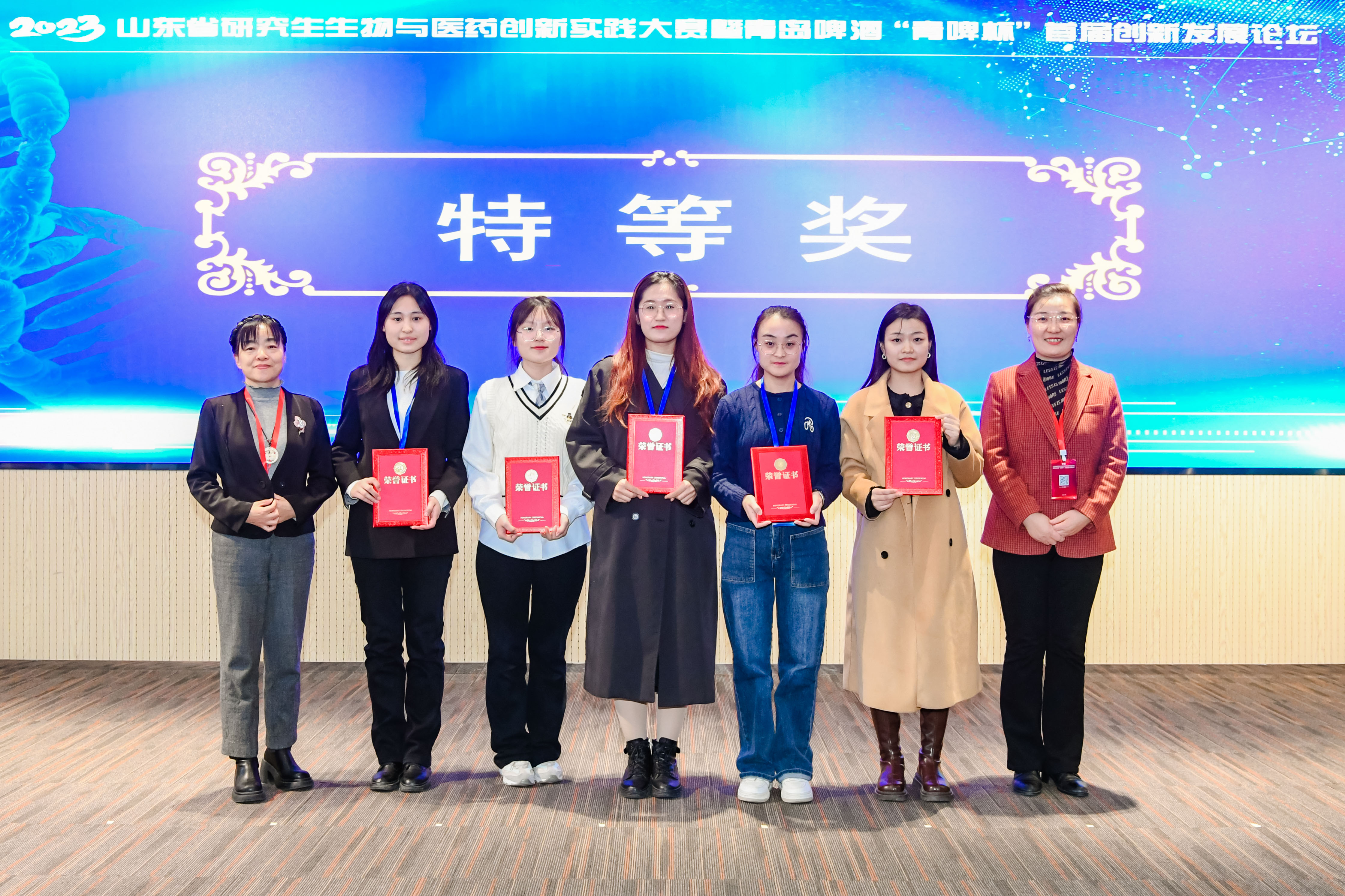 近日,2023年山东省研究生生物与医药创新实践大赛暨青岛啤酒“青啤杯”首届创新发展论坛在青岛大学会议中心圆满闭幕,来自山东省众多高等学府的38支队伍、近200名精英选手参与了此次盛会。经过层层选拔,由我院副教授谢昌健指导,研究生李晓薇、陈依晴、吴欣、陈海洋组成的科研团队,凭借卓越的科研实力和不俗的现场表现,从众多参赛队伍中脱颖而出,荣获特等奖,位列山东省所有参赛队伍的第一名。