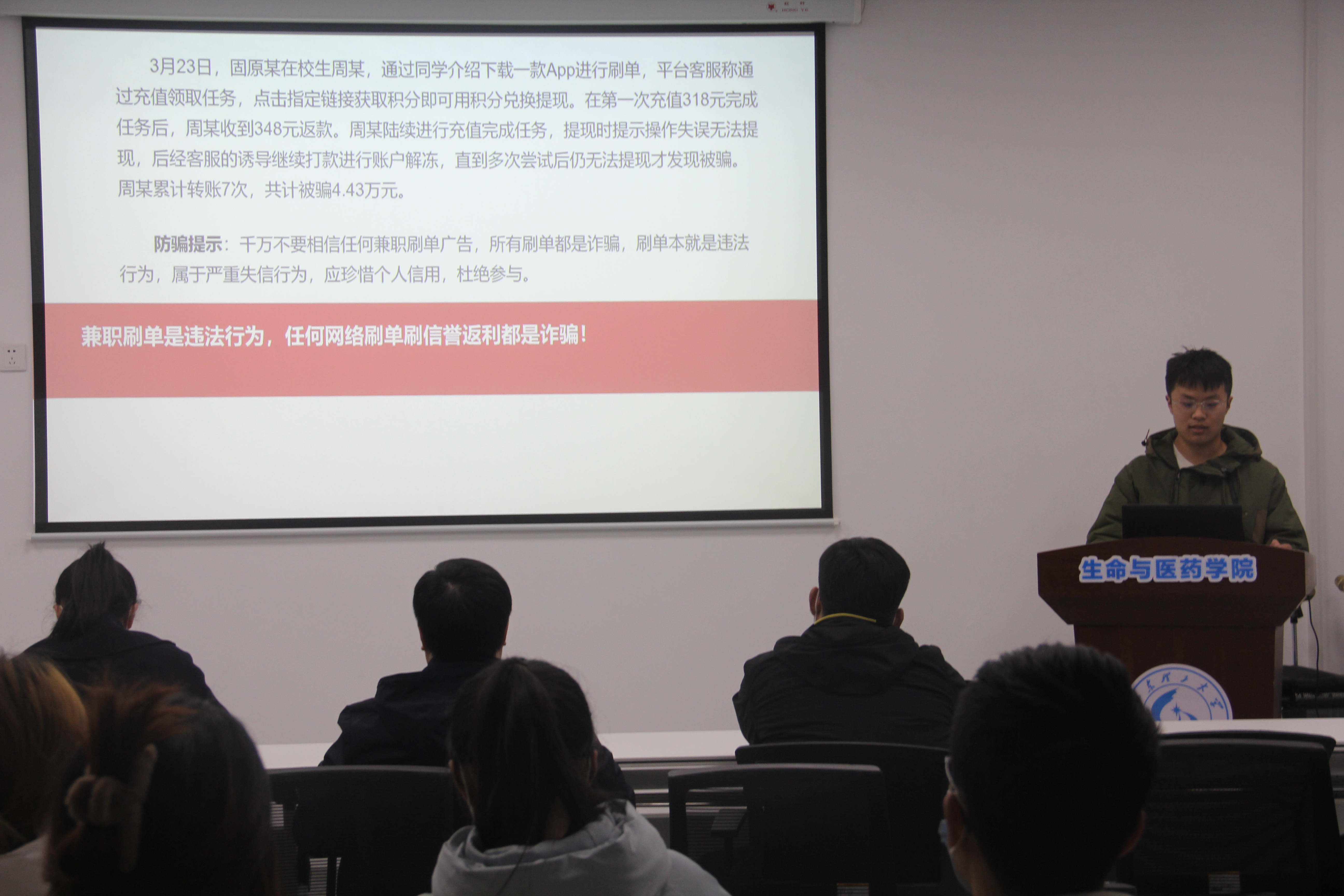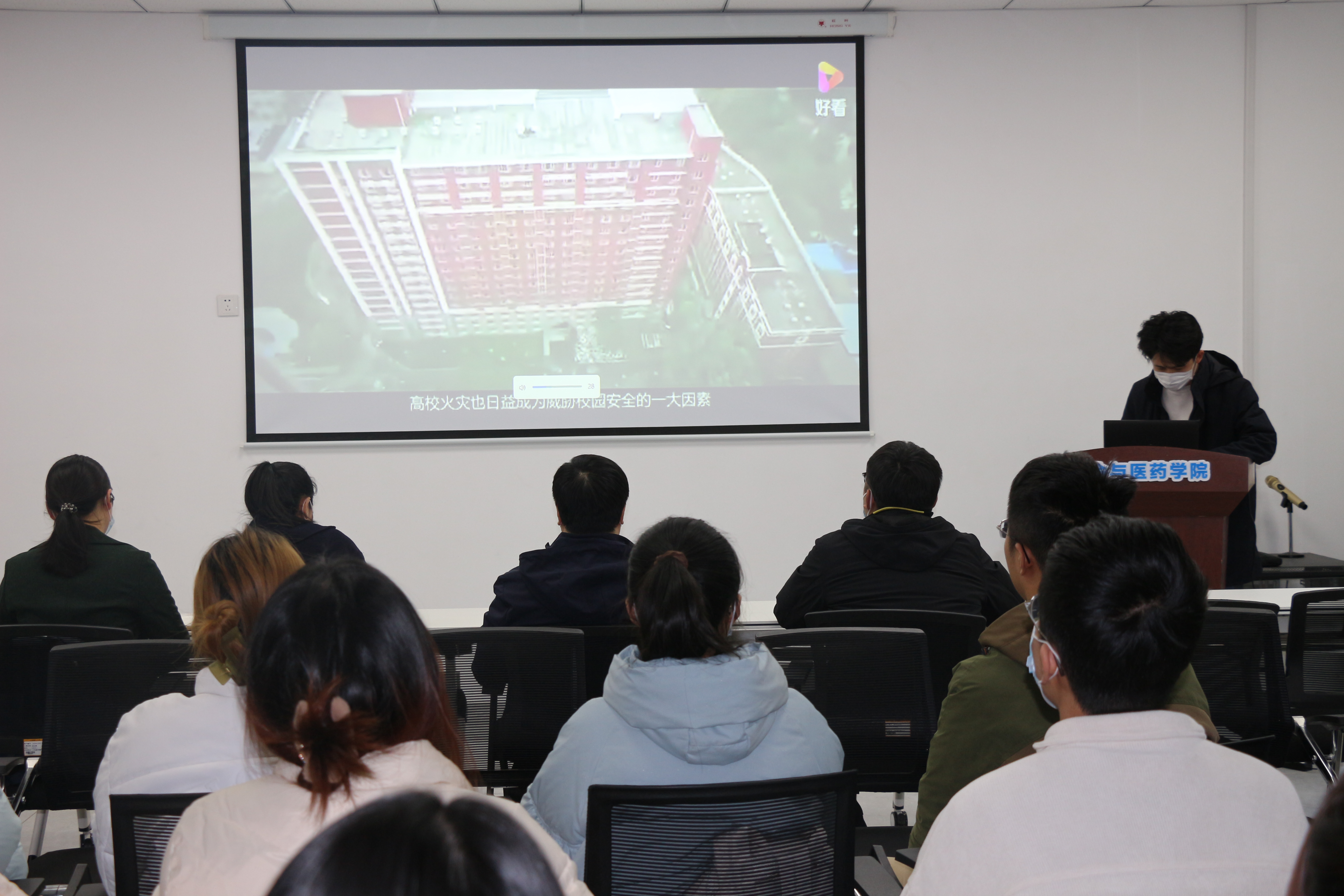 随后,孙晓处长从大学生一天中可能遇到的所有安全问题进行详细剖析讲解,让同学们意识到周围环境中存在的潜在危险。对于如何保障自身安全,提高个人“安商”,他提出3点希望与要求。一是要加强身边的安全教育,避免因小事而酿成大事故。二是要提高应急避险的能力,必须掌握逃生技巧,懂得如何有效安全逃生。三是要以身作则,带动身边的人注意安全,提高身边同学、朋友及家人的安全意识。
