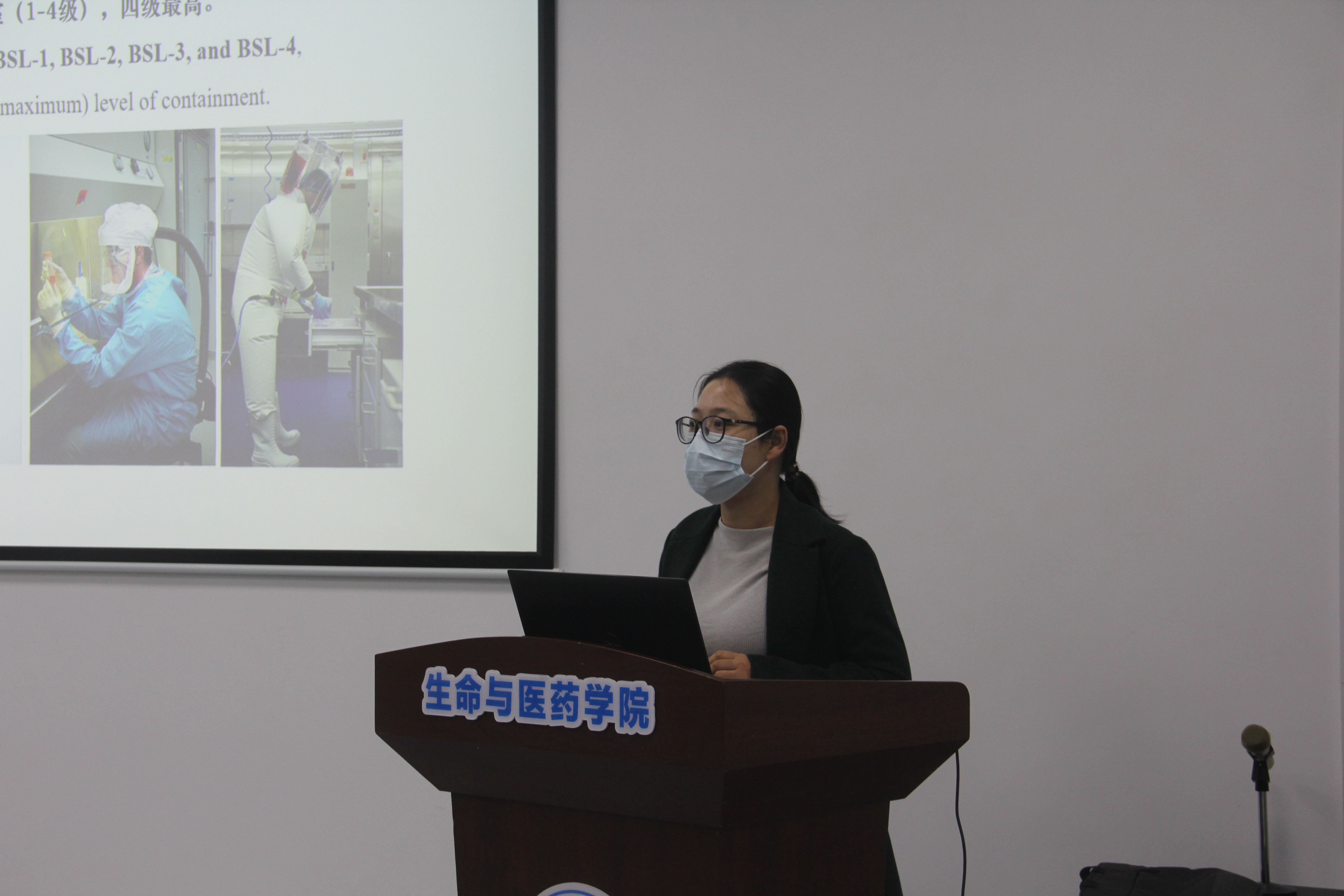 紧接着吴韦韦重点强调了实验室等方面安全注意事项。她从实验室准入制度、实验室日常安全制度以及实验室存在的安全隐患等进行了详细讲述,希望同学们要重视实验室的安全问题,尤其是在实验操作中,要时刻紧绷安全这根弦,熟悉掌握安全标识及应急方案,要牢记“事故出于麻痹,安全来于警惕”。