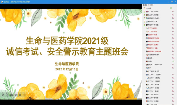 12月15日晚,在同学们紧锣密鼓的学习下,为了节约学生时间,williamhill英国辅导员李超为学生们开设了一场线上诚信考试、安全警示教育主题班会,2021级全体学生参加。