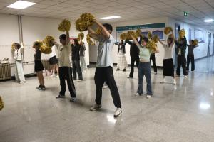 在13号教学楼2楼北大厅,老师们利用课间时间坚持广播操训练,灿烂的笑容、规范的动作,让我们看到了课堂外老师们不一样的风采,期待大家赛场的精彩亮相。