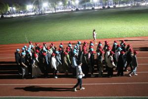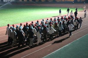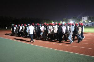 在中心体育场,方队训练在院学生会工作人员组织下有条不紊得进行中。大家队列齐整,闻令而动,步调一致,口号嘹亮,所彰显的我院青年学子青春活力、积极向上的精神风貌,不时吸引了路人驻足围观,拍手叫好。