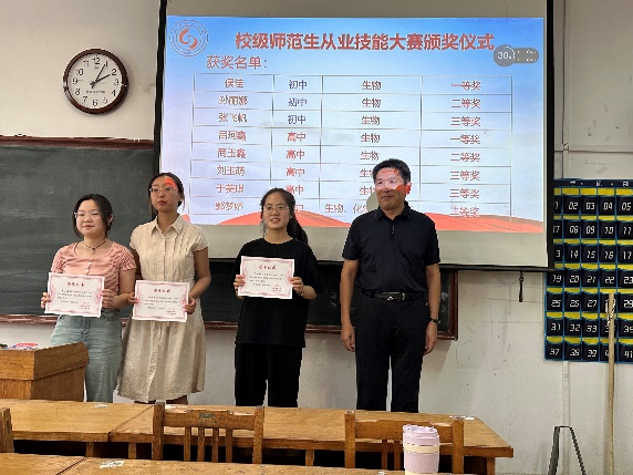 赵倩首先对总结会议的主要议程和目的要求做了简要说明,并强调集中听取同学们实习总结汇报,旨在通过同学之间的相互交流,总结经验、反思不足,为提升我院师范生教育质量提供宝贵经验。接着,王光坊为在2024年校级师范生从业技能大赛中获奖的同学颁发了荣誉证书。他代表学院向获奖同学以及所有顺利完成教育实习的同学表示热烈祝贺,并期望大家通过这次总结,全面回顾并深刻反思实习期间的经历,为未来做好教育教学工作打下坚实的基础。同时表示,学院将认真听取同学们的交流发言,虚心接受同学们的意见和建议,不断优化师范生培养方案,切实提升人才培养质量。王书记鼓励同学们珍惜实习经历,无论未来是否选择教育行业,都能以此为契机,为成为更优秀的自己积累力量,并祝愿大家未来充满无限可能。