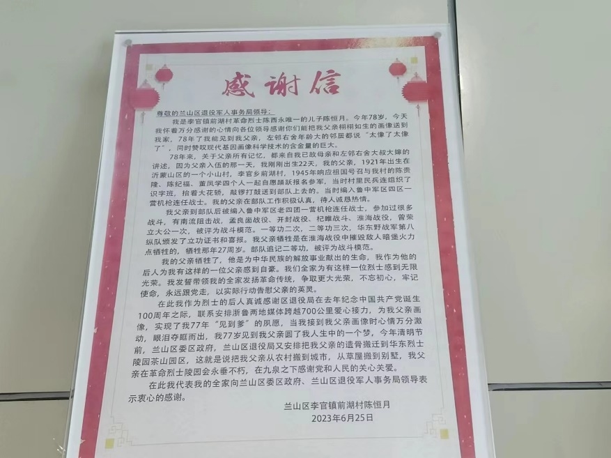 随后,实践团成员们还参观了退役军人事务局的办公场地及设施,深入洞悉了事务局的工作流程与服务内涵。实践团留意到退役军人事务局内陈列的感谢信,曲副局长徐徐讲述了它背后的感人故事:77 岁的陈恒月,出生仅 22 天,父亲便投身军旅,而后壮烈牺牲于淮海战役。他只能依靠村里老人的回忆来拼凑父亲的形象,对着镜子去想象。清明前夕,“为百位烈士画像”公益活动启动,陈恒月率先报名。经过两天的精心创作,2021年4月7日,他收到父亲的画像,喜极而泣,声称与自己想象中的毫无二致。虽然从未见过父亲一面,但他一直为父亲是英雄而倍感骄傲,此次终于圆了多年的心愿。