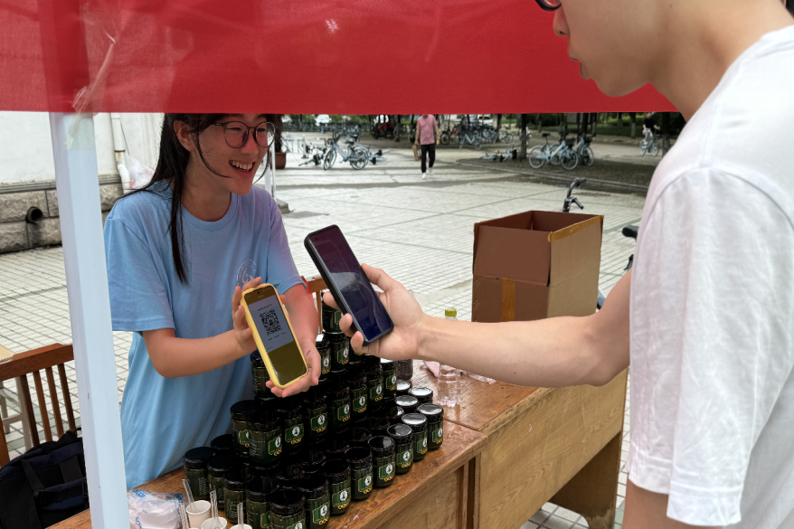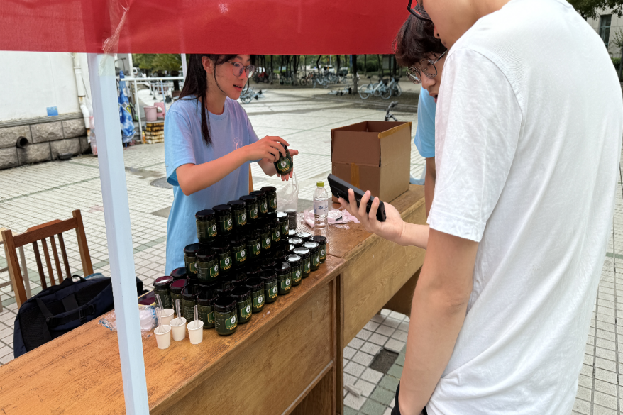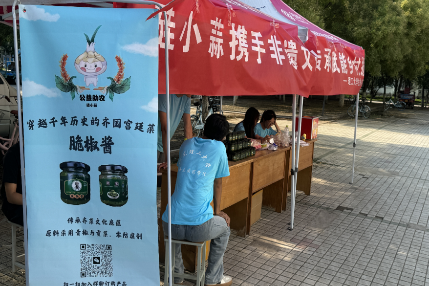 在售卖过程中,硅小蒜科技助农团成员热情地向往来的学生教职工及路人介绍脆椒酱的生产过程及功效作用,旨在不让任何有意向的人错过这道健康美食,更是提供试吃服务,确保顾客对味道满意后再售出产品。这款结合科技助农成果,融合齐菜非遗技艺与现代饮食科技的产品收到顾客的一致好评。