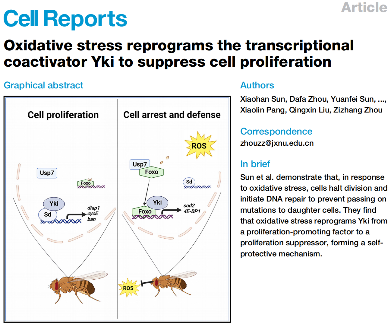 近日,我院杨凤堂教授团队青年教师孙小涵以第一作者在Cell 子刊《Cell Reports》上发表题为“Oxidative stress reprograms the transcriptional coactivator Yki to suppress cell proliferation”的学术论文,首次揭示氧化压力能重编程促增殖因子Yki,让其获得抑制细胞增殖活性,并激活DNA损伤修复,以维持机体稳态。