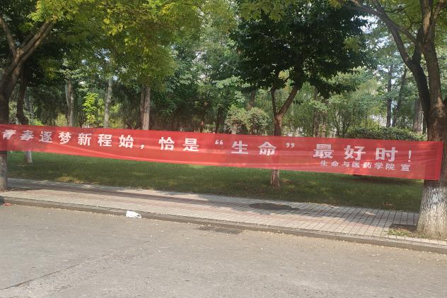 迎新点外,醒目走心的迎新标语同志愿者们热火朝天搬运新生行李的服务场景交相呼应,浓浓暖意,充斥心间。
