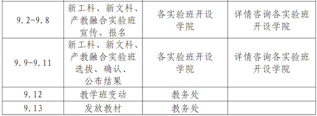 4. 选拔与公示:相关单位与学院根据实验班选拔考核办法选拔学生。选拔结束务必与学生本人联系,确认最终的选拔结果后予以公示。学院公示结束后将院长签字盖章的选拔结果报教务处。