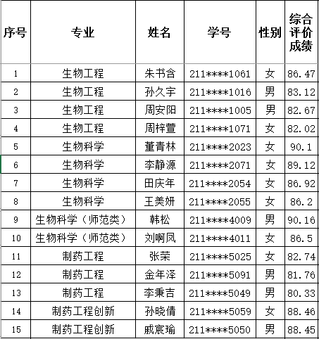 生物工程专业4人,生物科学专业6人(含师范类),制药工程专业5人(含创新实验班)