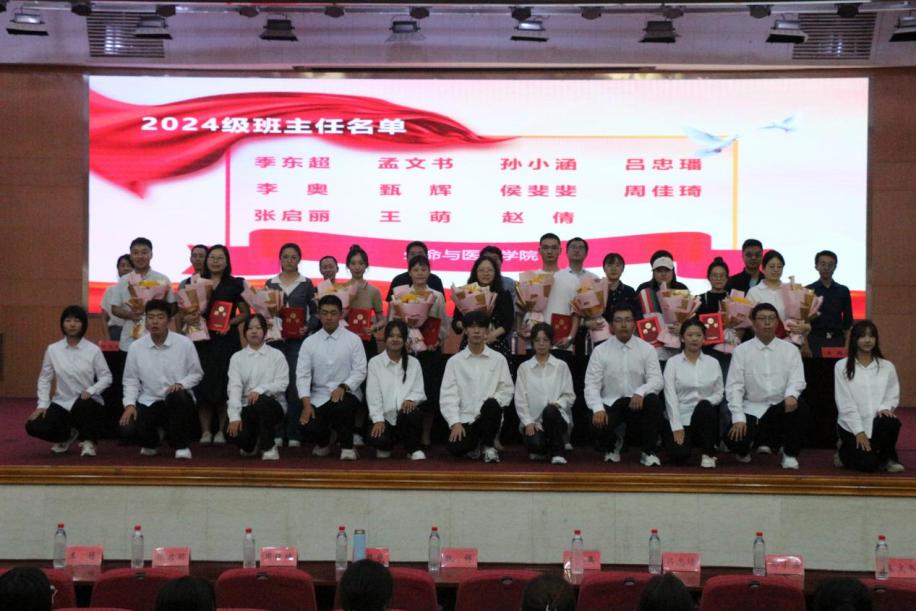 在热烈掌声中,院领导为2024级本科生班主任颁发了聘书,并由2024级各班级代表上台为班主任敬献鲜花。