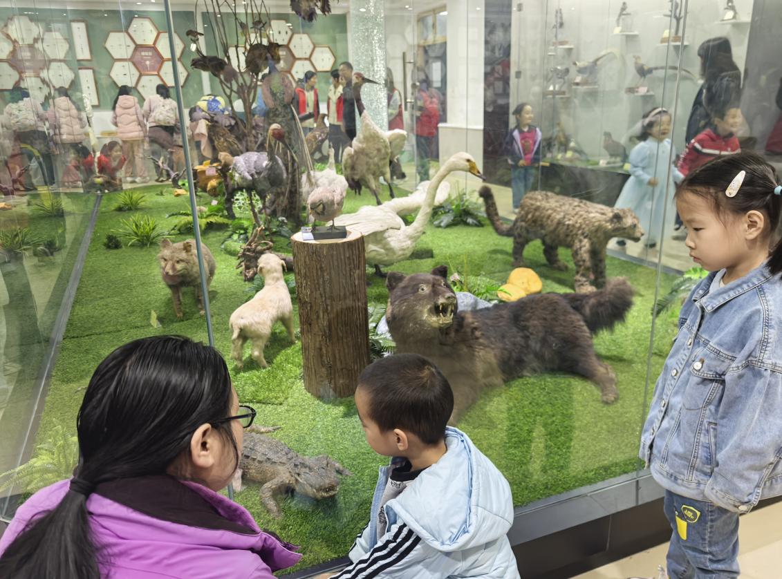 标本室里,各种动植物标本琳琅满目,引发了孩子们强烈的好奇心。青青环保社成员曹源、刘扬帆为孩子们耐心讲解,小朋友们听的格外认真。讲解结束后,讲解员组织大家进行自由观察,小朋友们认真地观察着每一个标本,不时地向老师和讲解员提出各种问题。在扬子鳄的标本前,一位家长走上前去,用生动有趣的语言,为孩子们讲解起扬子鳄的生活习性、繁殖方式以及保护意义等内容。他的讲解深入浅出,引人入胜,孩子们听得津津有味。
