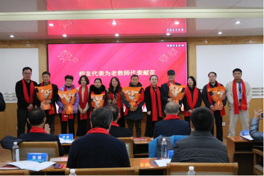 校友代表向赵博生、赵凤云、张秀芳、胡巍、丁忠峰、徐恒戬等六位老教师代表献花。