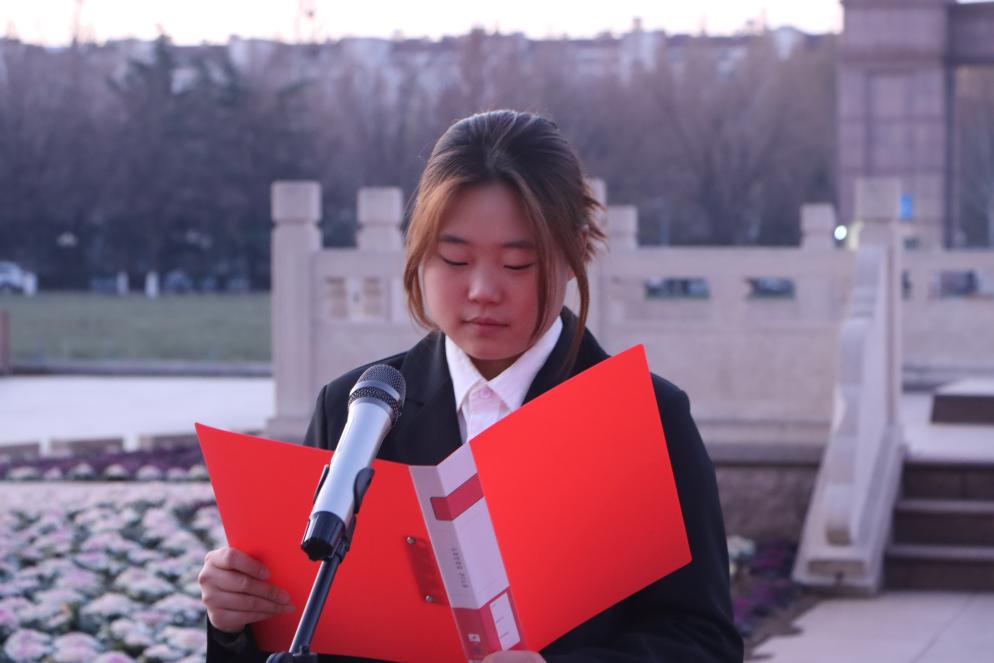 2024级新生代表、生科2401班韩怡寒发言,沉痛悼念南京大屠杀死难同胞,表示将铭记历史,勤奋求学,努力成长为高素质应用型人才,为社会主义现代化强国积极贡献智慧力量。