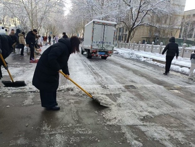 清晨,学院师生迅速集结,手持工具奔赴环岛西路至环岛东路路段,铲雪除冰。尽管寒风刺骨,但热情不减。铁锹与冰面的碰撞声、扫帚的沙沙声,奏响了“劳动交响曲”。