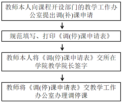 一、所有授课活动均须按既定课表开展。确需调、停课的,须提前至少2个工作日提出申请并到教学办公室进行调、停课办理,具体流程如下: