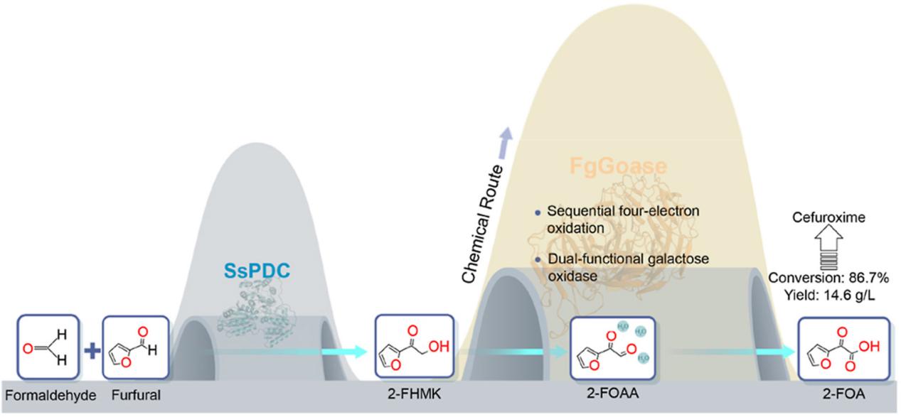 头孢呋辛作为第二代头孢菌素类抗生素,在治疗多种感染性疾病方面发挥着重要作用。2-(呋喃-2-基)-2-氧代乙酸(2-FOA)是合成头孢呋辛的关键中间体。目前,工业生产2-FOA主要依赖于化学合成,存在反应条件苛刻、使用有毒试剂、环境污染严重等诸多问题。为解决上述难题,该团队致力于探索绿色、可持续的生物催化合成途径。在前期工作中,团队利用ThDP依赖性酶高效合成中间体2-呋喃基羟基甲基酮(2-FHMK)(成果发表于Green Chemistry),为2-FOA的生物合成奠定了基础。然而,2-FHMK进一步氧化生成2-FOA的步骤仍是该生物催化路线中的瓶颈所在。