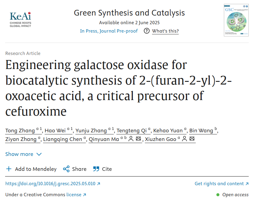 近日,我院马钦元/高秀珍团队在生物催化合成头孢呋辛关键中间体领域再次取得重要突破。相关研究成果相关研究以“Engineering galactose oxidase for biocatalytic synthesis of 2-(furan-2-yl)-2-oxoacetic acid, a critical precursor of cefuroxime”为题,发表于本领域Top期刊《Green Synthesis and Catalysis》(中科院一区top,IF:8.3)。