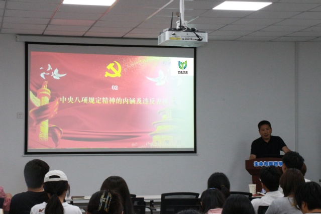 课上,王光坊详细介绍了中央八项规定的由来及主要内容,讲述了中央八项规定的历史沿革及实践演进,用喜闻乐见的漫画方式,生动的展现了中央八项规定精神内涵及违反表现,并通报了部分典型案例,汇报了学院学习教育的开展情况。他深情勉励师生党员,要牢牢把握学习教育这一有利契机,着力提升自身理论修养和思想素质,认真落实学校党委“敢字为先、干字当头”工作要求,淬炼“思想解放、勇于创新、事争一流”的精神状态和“务实、求实、落实”的工作作风,在推进学校学院事业能级跃升中努力“做最好的自己”!
