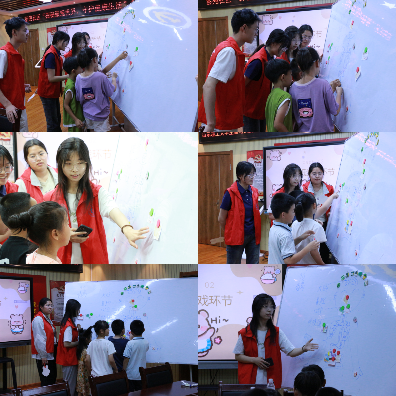 讲解结束,便要考一考大家的记忆力了。在这轮小游戏中,儿童们以组为单位,将给出的两种微生物放在他们的常见位置上,并说出他们的影响。