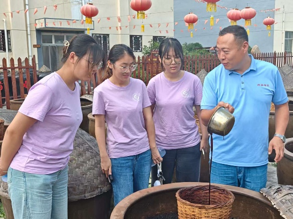 踏入厂区,酱香和醋香扑面而来,实践团成员立刻对传统酿造工艺产生了兴趣。在工作人员带领下,实践团成员先进入酿造车间,近距离看酱油和食醋是怎么生产的。负责人拿着长勺舀起原料,给实践团讲了整个流程:从选饱满的黄豆、高粱,到控温蒸煮、制曲,再到发酵、淋油和陈酿。每个环节都让 “荧侦探” 团队感受到福藤人几十年的用心,也让实践团成员想到,荧光探针技术或许能用来监测食品发酵时的品质变化,这为技术在酿造食品检测上的应用提供了实际思路。