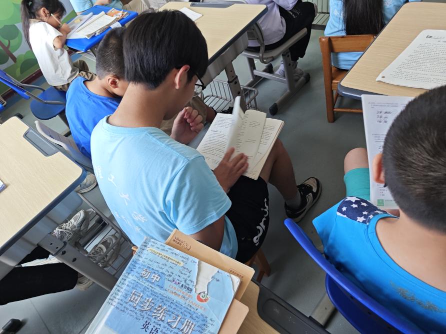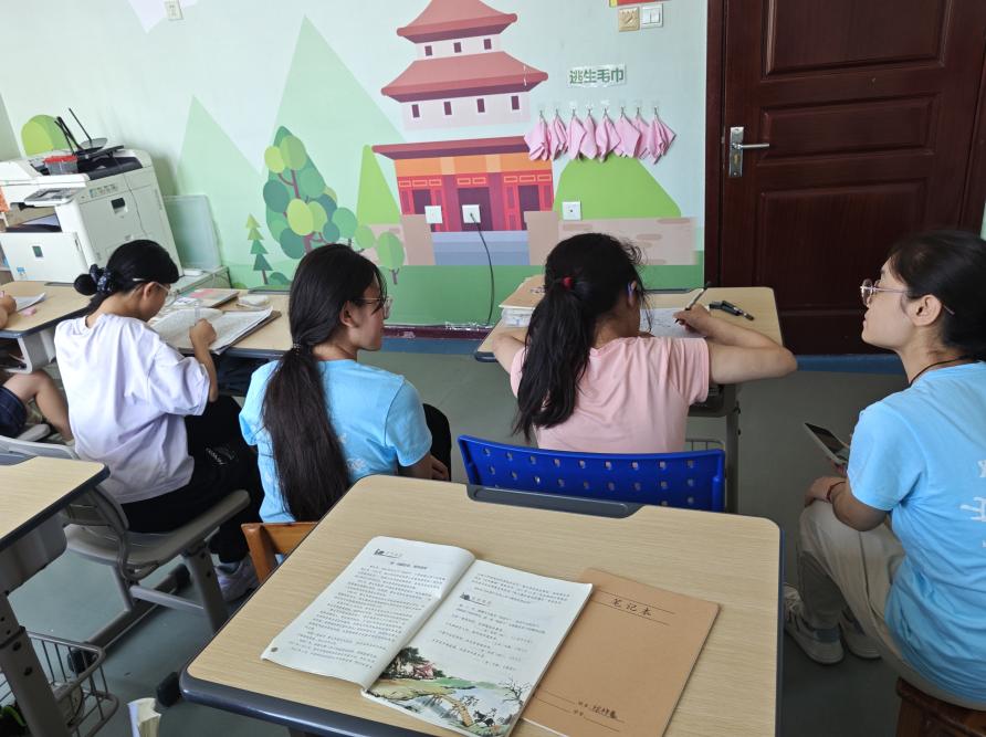活动伊始,实践团成员根据孩子们的年级和学科需求,组建了涵盖英语、数学、物理、地理、语文五大学科的"一对一"辅导小组。在二楼学习室,实践团成员针对小学一到五年级的暑期作业开展分层辅导:数学组用糖果模型讲授分数概念,语文组以绘本故事引入写作技巧,英语组则通过单词闯关游戏强化记忆。“姐姐,这道鸡兔同笼的题我一直不会,今天终于听懂了!”孩子们兴奋地向团队成员们分享自己学习上进步的喜悦与成就感。