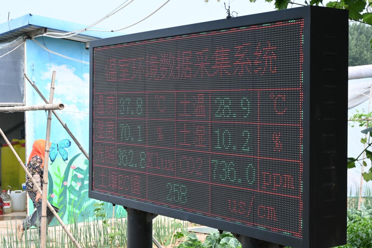 行走于田间,助农团成员来到了大棚种植地,每个大棚都配有温室环境数据采集系统。随后成员们在讲解人员的带领下,进入了种植黄瓜的大棚,切实感受了作物的生长环境和生长情况,此外,基地内还有其他众多温室大棚,种植着茄子、西红柿等各类蔬菜以及葡萄等水果。这些大棚实现了数字化、智慧化管理,可通过管理平台自动浇水、自动通风。同时,采用以色列专利水肥一体化灌溉技术,能针对不同果蔬地块进行精准灌溉施肥,进一步提升种植效率和精细化程度。