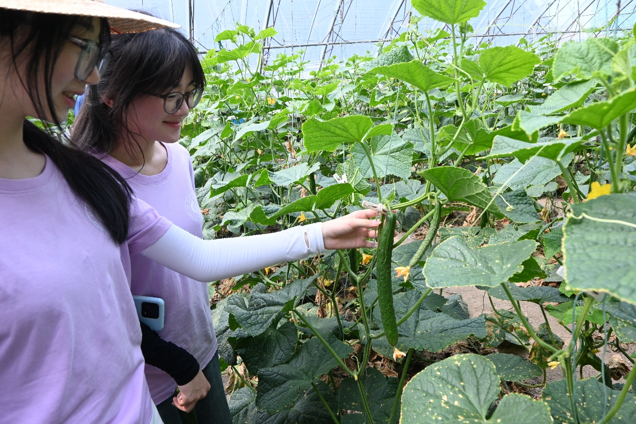 图为团队成员在黄瓜种植大棚