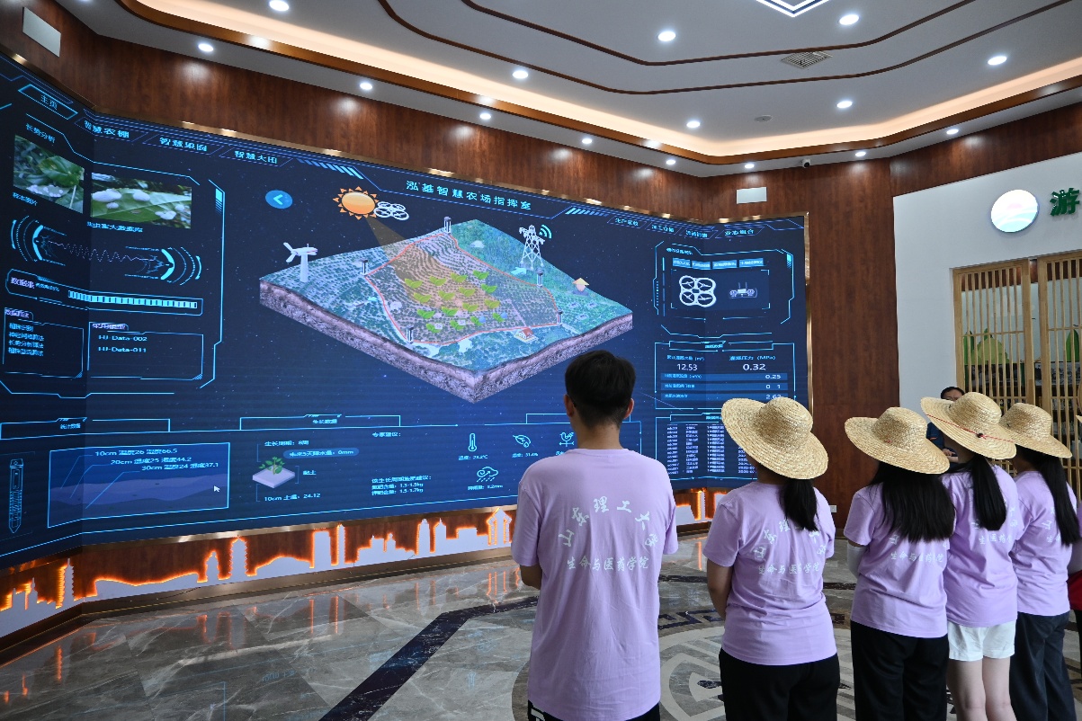 通过工作人员讲解,实践团成员了解到,泓基农业园区布局形成“一心两园”格局。“一心”是数字农业控制研发中心,“两园”为生态果树种植园和绿色蔬菜种植园。且通过工作人员分享,实践团了解到了智慧农业的技术应用和经营模式,依托智慧农业管理平台,运用农田精准气象、卫星遥感监测等技术,实现科学化、标准化种植管理;采用了“数字农业+研学”“数字农业+观光”等融合模式,推动了农业科技的传播与应用 。