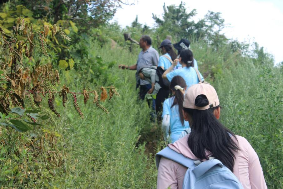 为切身感受历史,实践团在当地村民向导带领下,深入山林实地探寻野菜分布。成员们克服山路崎岖,亲身体验革命先辈采挖野菜充饥的艰辛历程。向导沿途详细介绍了何首乌、野苋菜等具有药用或食用价值的山野植物。调研过程中,团队分工协作:摄影组拍摄植物样本及地貌特征;记录组标注野菜种类、形态;识别组负责辨识记录植物信息,为建立详实的野菜资源档案收集了一手资料。