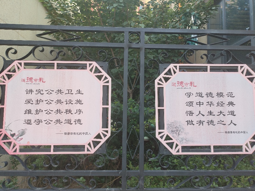社区围栏的“遵德守礼”文化牌,以亲切的风格呈现文明规范。实践团发现,牌上“讲究公共卫生”“爱护花草”等内容,正与青少年的日常行为场景呼应,潜移默化中引导他们从细节处养成文明习惯,体现了文化牌的“浸润力”—— 把文明规范变成日常指引,让青少年从“被动听”变为“主动做”。