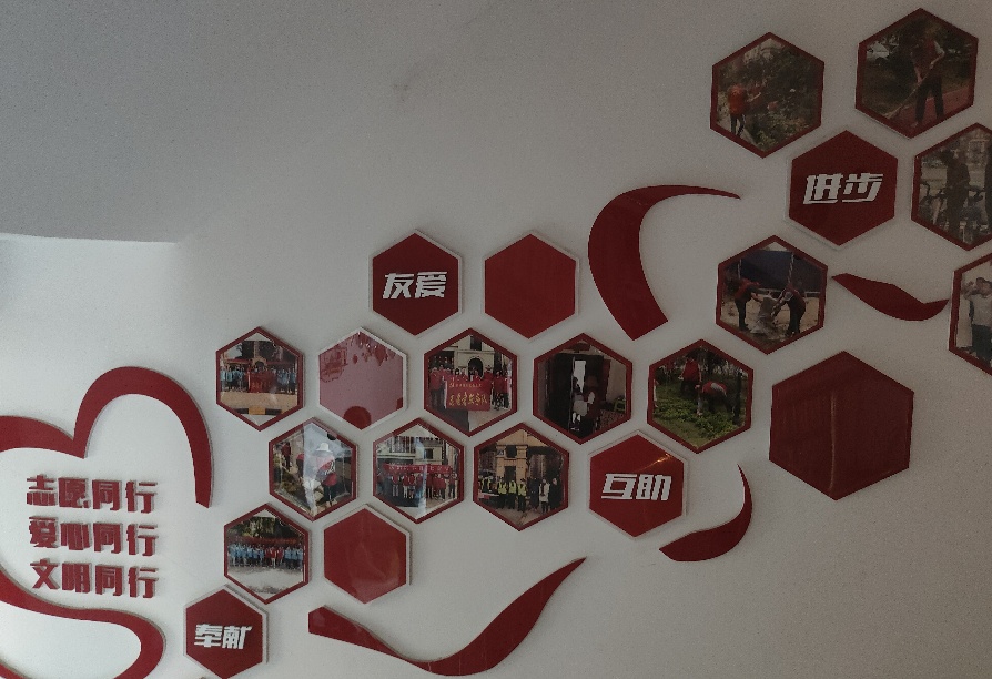 移步至“志愿同行”主题墙,六边形相框里,青少年参与植树、帮扶的画面格外生动。实践团观察到,这些真实的志愿场景,能打破青少年对“奉献”的距离感。原本抽象的“志愿服务”,因同龄人的身影变得具体可感,激发青春担当,引导更多青少年主动参与社区温暖传递,让“奉献”从理念变成日常可做的小事。