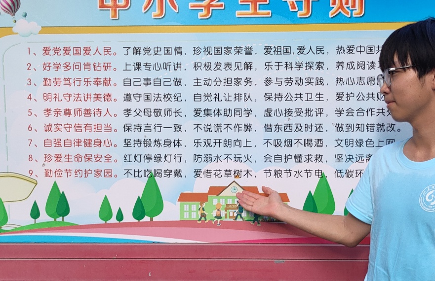 踏入社区广场,《中小学生守则》文化墙率先进入视野。守则内容与校园德育深度衔接,搭配的校园场景插画让严肃的规范变得生动。实践团成员注意到,不少青少年路过时会自然驻足,有的还会小声念出上面的条目。这面墙如同“隐形纽带”,将校园教育与社区生活串联,让品德规范在青少年的日常穿梭中悄然扎根。