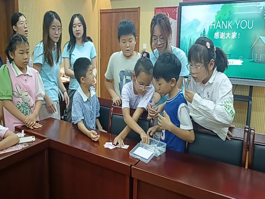 随后,在“小小水质检测员”环节,实践队员带领孩子们化身“科学侦探”。团队精心准备了矿泉水、自来水、肥皂水,柠檬水等不同水样,指导孩子们使用pH指示剂进行检测。“我的试管里的水变红了!”“这个怎么是蓝色的?”孩子们专注地比对色卡,在实践团员的引导下理解酸碱度对水生生物的影响。当发现日常饮用水pH值最接近中性时,孩子们恍然大悟:“原来保护湿地和水质健康息息相关!”