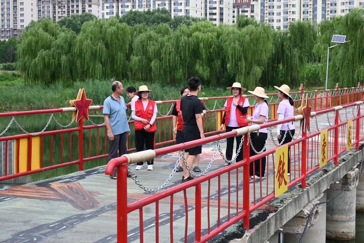 “金沙水拍云崖暖,大渡桥横铁索寒”,初入西夏高庄村,助农团首先走过了一座以泸定桥为原型的创意桥梁。在桥上行走的途中,团队成员遇见了两位饭后散步的热心村民。经交流后成员们得知,这座桥也是沂河之畔儿童乐园的体验区之一。随后助农团成员向其询问起村内群众对飞夺泸定桥这一革命故事的了解情况,以及这座桥对人们熟悉红军长征革命历史的增进效果。据村民回答,这座桥通过有趣的体验加深了参观人员对于红军飞夺泸定桥的认识,不仅让人们身临其境地了解到了这段革命事件,更让他们体会到了飞夺泸定桥的艰难及革命先烈的英勇无畏与坚强意志。随后,助农团成员同村民一起前往沂河之畔儿童乐园。