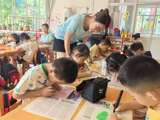 随后,实践团成员基于幼儿认知特点,设计"我眼中的湿地生态"绘画表达环节,旨在让儿童用绘画呈现湿地生物关系。成员通过面对面的互作绘画,引导儿童自主思考如何保护画笔下色彩斑斓的湿地,从而做到寓教于乐。
