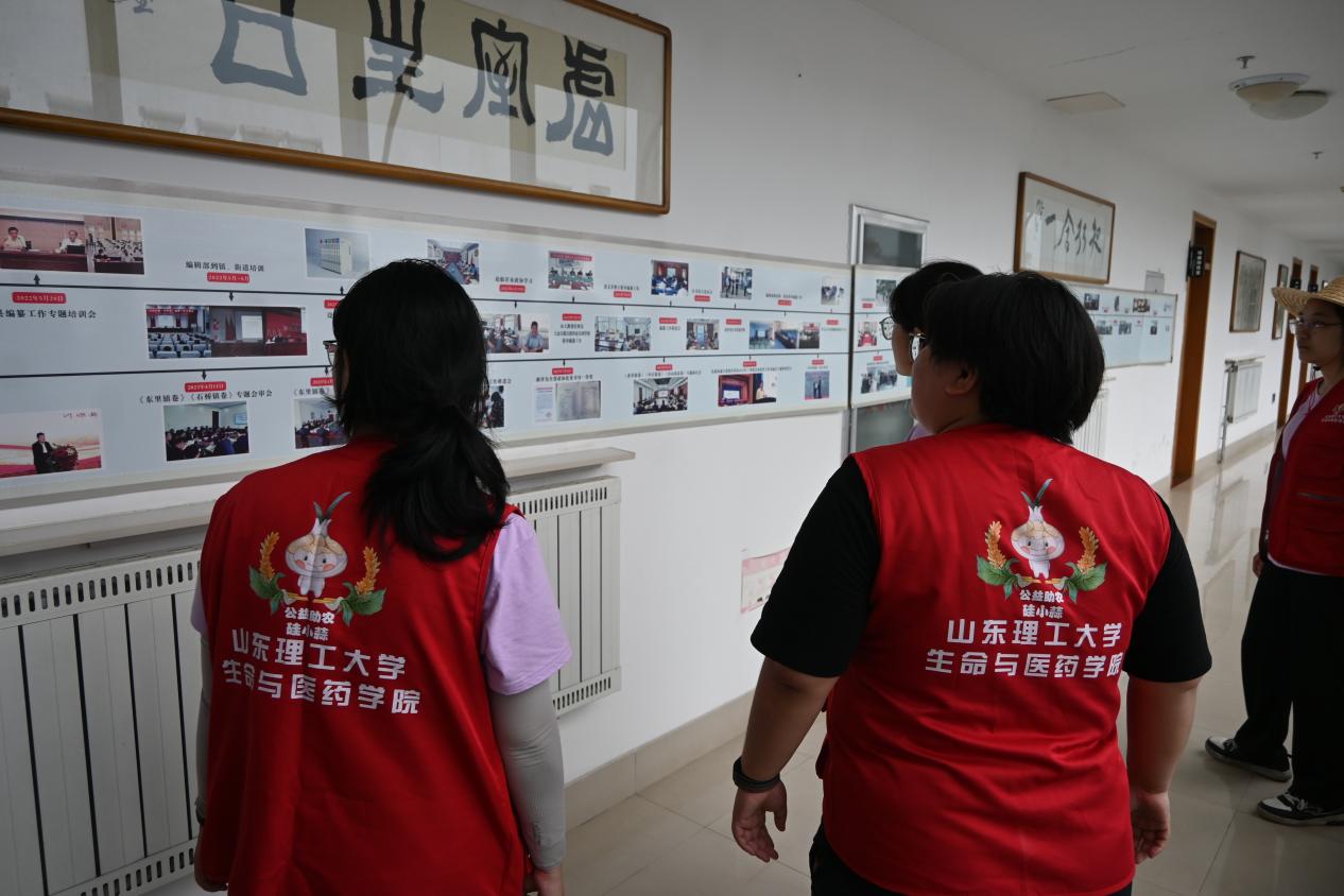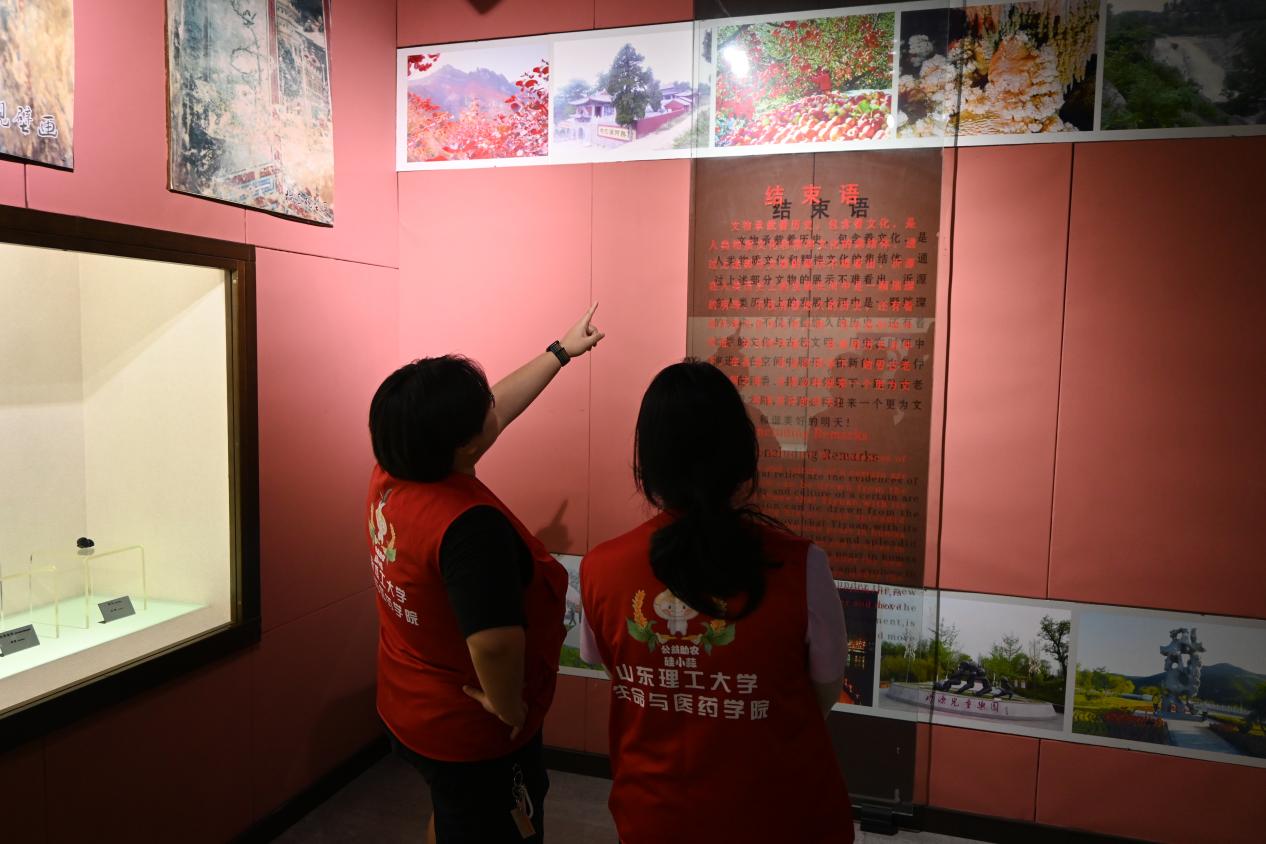 走进沂源县新时代文明实践中心,楼内建设层次分明,集县文旅局、县博物馆与县非遗文化中心等于一体,且随处可见有关文化建设的相关标语。据当地居民与有关工作人员介绍,成员们了解到,县博物馆与非遗文化中心的非遗文化长廊均为免费对外开放,且县博物馆已作为研学志愿对接地,与多个学校开展研学交流与志愿服务活动。