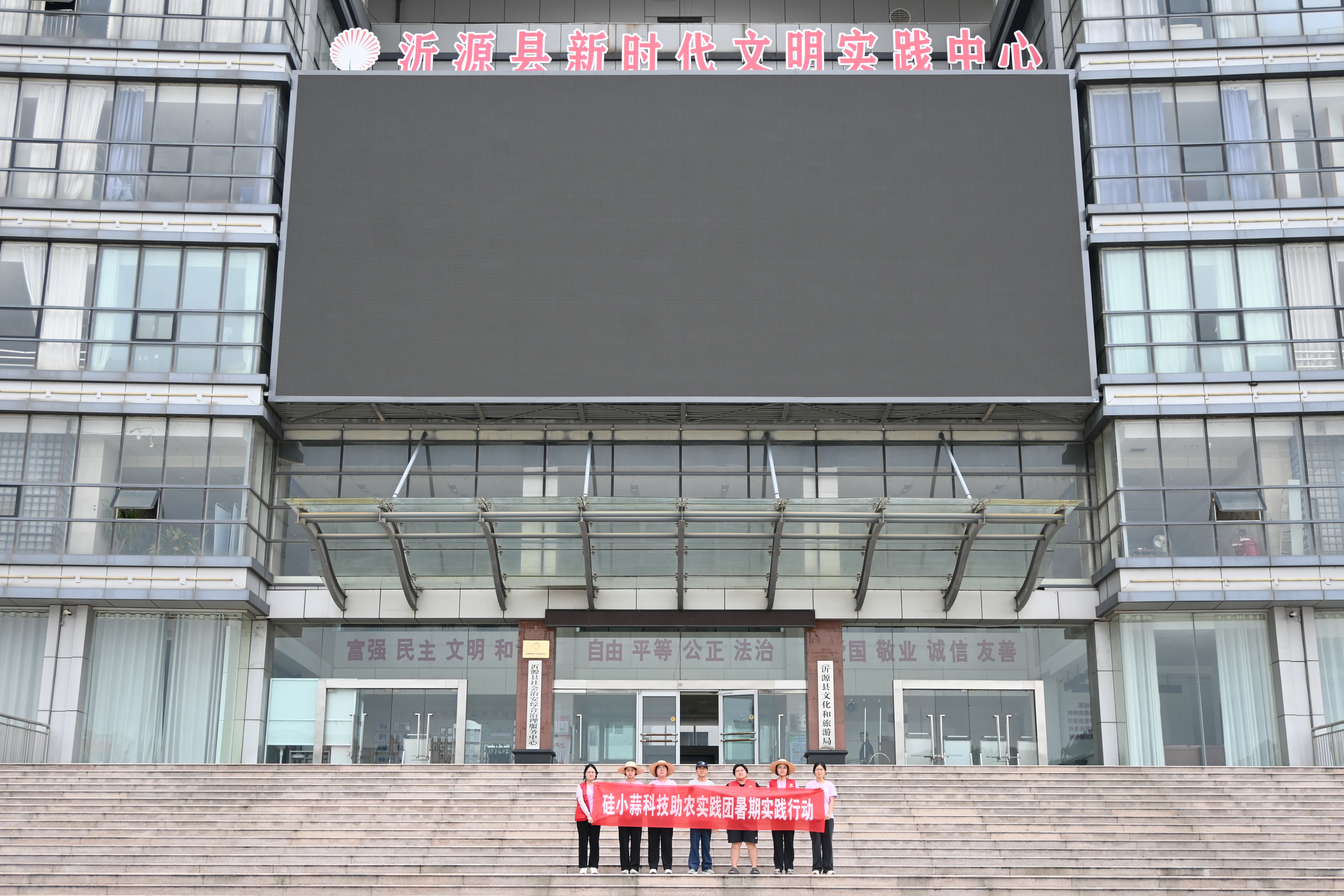 图为硅小蒜科技助农团与工作人员在沂源县新时代文明实践中心合照