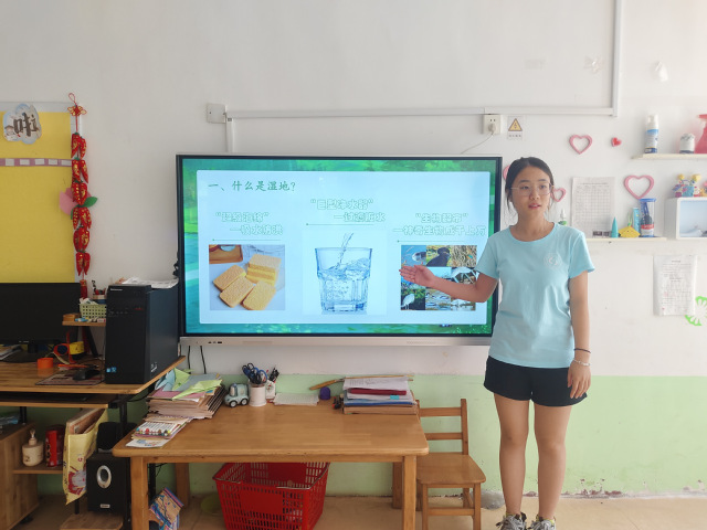 首先,实践团成员运用符合幼儿认知的图文材料,以马踏湖的生态环境为具体案例,向孩子们介绍湿地的相关知识及湿地对生态的重要意义,引导幼儿建立初步的湿地保护认知。期间穿插互动问答,通过即时沟通让抽象的知识变得更易理解,帮助孩子们加深对湿地相关内容的记忆。