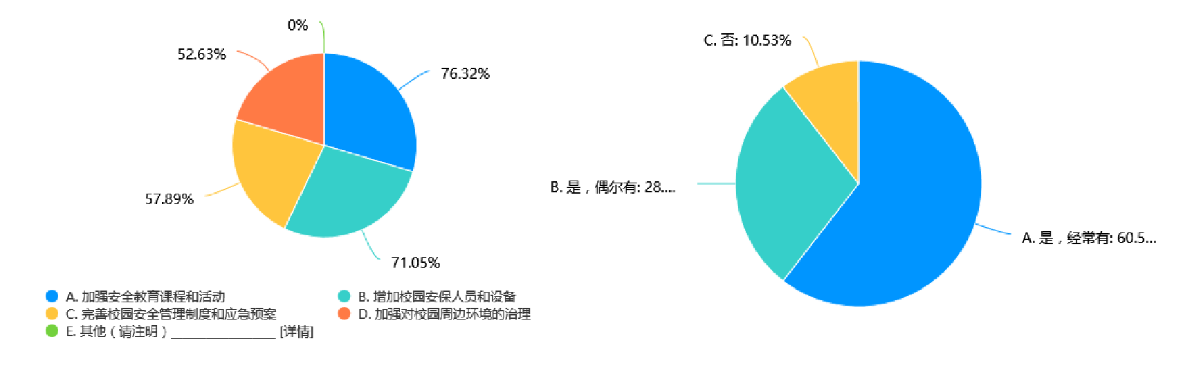 同时,76.32%的受访者希望学校能够加强安全教育课程和活动,这进一步强调了教育在提升校园安全意识方面的关键作用。